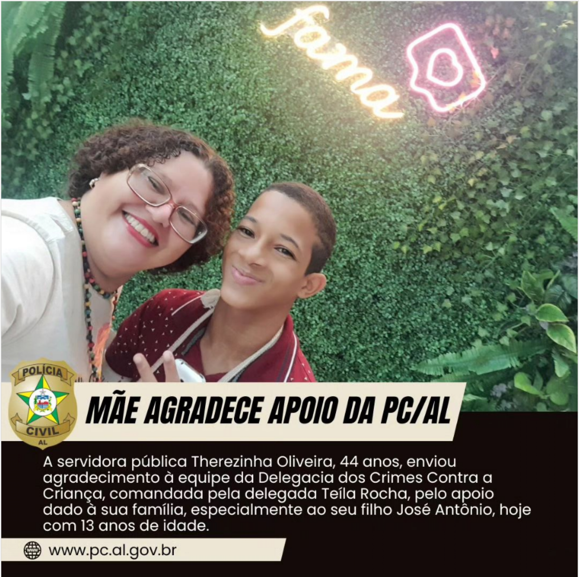 A servidora pública Therezinha Oliveira, 44 anos, enviou agradecimento à equipe da Delegacia dos Crimes Contra a Criança, comandada pela delegada Teíla Rocha, pelo apoio dado à sua família, especialmente ao seu filho José Antônio, hoje com 13 anos de idade. Funcionária da Secretaria de Estado da Saúde, ela conta que o filho tem sintomas de hiperatividade e toma medicamentos.