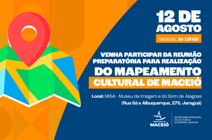 A Secretaria de Cultura e Economia Criativa de Maceió (Semce) promoverá sábado (12), a partir das 18h30, uma reunião com lideranças culturais locais para a apresentação do projeto de mapeamento cultural de Maceió. O objetivo do projeto é mapear a comunidade de artistas, criadores e fazedores de cultura, como: grupos artísticos, manifestações culturais populares, festivais e demais eventos culturais que ocorrem na capital alagoana. O encontro acontecerá no Museu de Imagem e do Som de Alagoas (Misa), no bairro de Jaraguá.