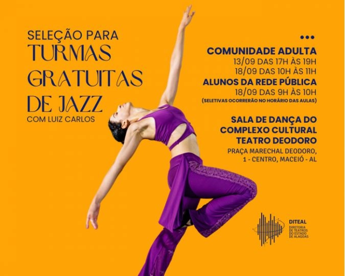A Diretoria de Teatros do Estado de Alagoas (Diteal) anuncia a abertura de mais uma turma de jazz gratuita aos sábados, ministrada pelo professor, bailarino e coreógrafo Luiz Carlos dos Santos. O órgão informa ainda que há algumas vagas para as turmas de jazz para iniciante.