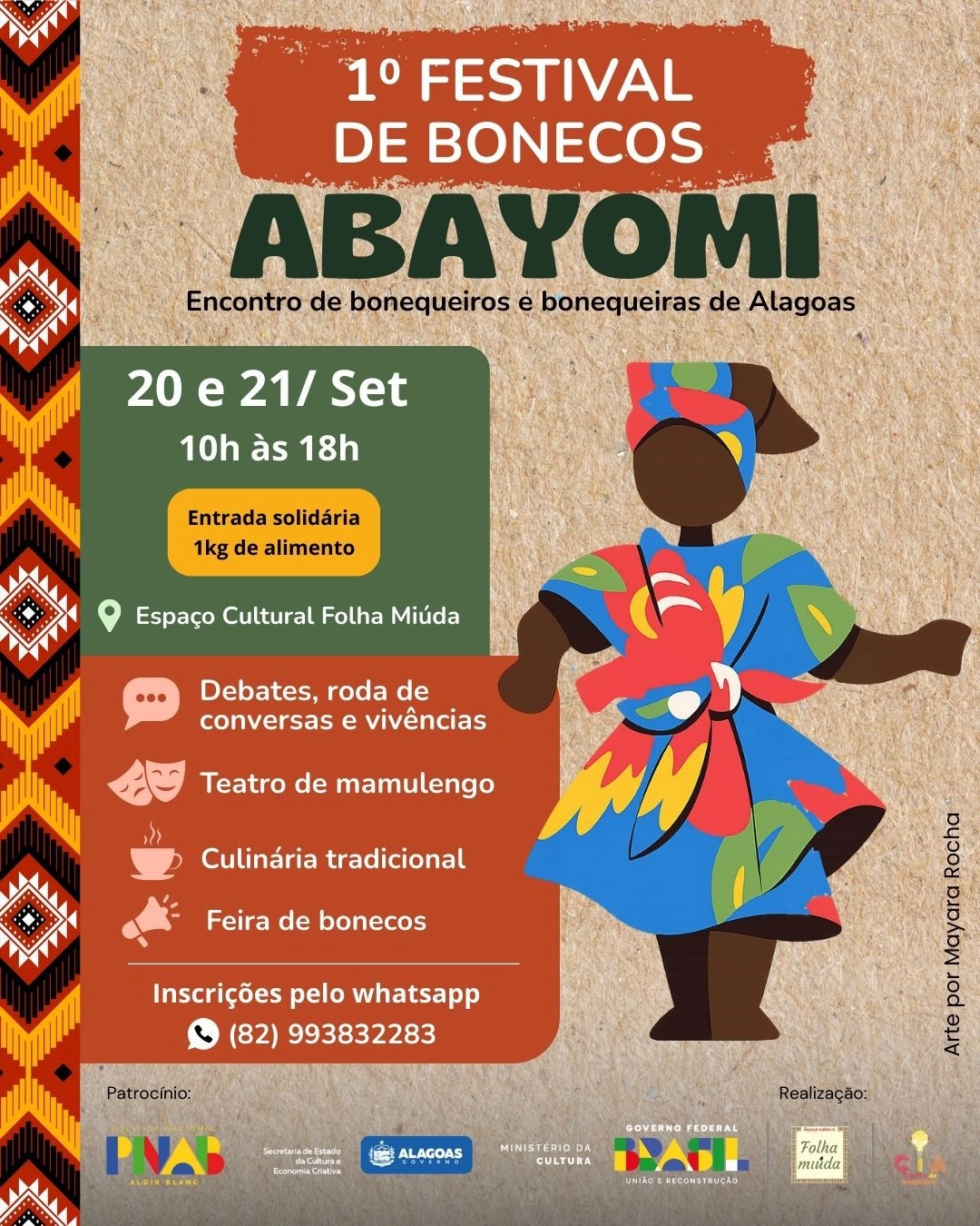 O município de Marechal Deodoro recebe, nos dias 20 e 21 de setembro, o 1º Festival de Teatro de Bonecos Abayomi, no Espaço Cultural e Teatro Folha Miúda. O evento, contemplado pelo Edital de Fomento aos Povos Tradicionais, da Secretaria de Estado da Cultura e Economia Criativa de Alagoas (Secult), celebra a arte dos bonecos africanos e o diálogo com o teatro de bonecos nordestino, em especial o mamulengo.