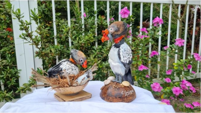 A artista alagoana apresenta peças produzidas a partir do reaproveitamento de materiais descartados, como quengas de coco, galhos e pequenos troncos, transformando o que seria lixo em obras de arte que despertam consciência ambiental e poética.