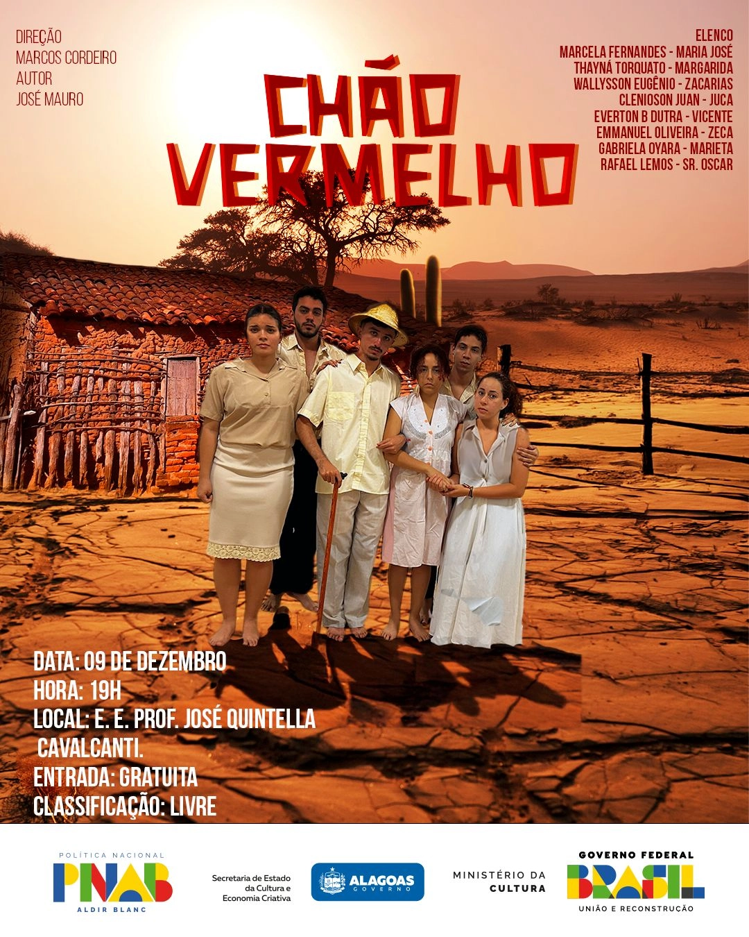 O Teatro do Planetário e Casa da Ciência de Arapiraca recebe, no dia 8 de dezembro, às 19h, o espetáculo “Chão Vermelho”, que também será apresentado no dia 9 de dezembro, no mesmo horário, na Escola Estadual Prof. José Quintella Cavalcante. Com entrada gratuita e classificação livre, a obra leva ao público a trajetória de uma família sertaneja que enfrenta a seca no sertão alagoano nos anos 1970, destacando temas como resistência, memória, desigualdade social e identidade cultural.