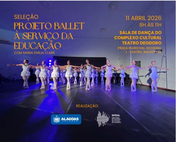 A Diretoria de Teatros do Estado de Alagoas (Diteal), em parceria com a bailarina Maria Emília Clark, promove no próximo dia 11 de abril (sábado) a seletiva 2026 para o projeto Ballet à Serviço da Educação. A ação integra o projeto “Formação do Bailarino Clássico e Projetos Coreográficos Diversos”, iniciativa gratuita que há 10 anos contribui para a formação artística de estudantes da rede pública em Alagoas.