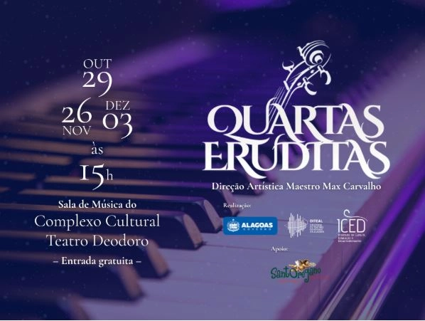 Fruto da parceria entre a Camerata Ero Dictus e a Diretoria dos Teatros de Alagoas (Diteal) e dirigida pelo maestro Max Carvalho, o projeto promove a interação direta entre músicos e alunos em uma experiência única de aprendizado. Nesta retomada, o Quartas Eruditas já tem três apresentações previstas ainda para este ano, nos dias 29 de outubro, 26 de novembro e 3 de dezembro.